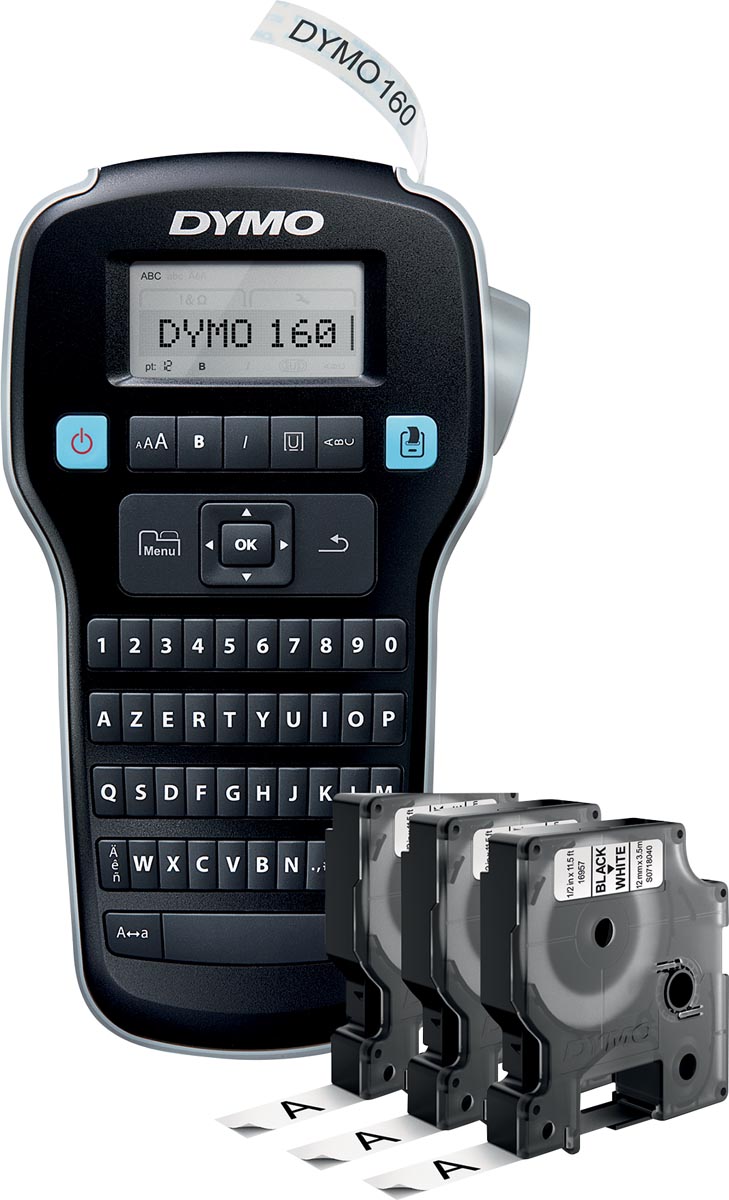 Het perfecte starter pack voor uw bedrijf, op kantoor of als u aan het werk bent thuis. Inhoud: – 3 x D1 tape 12 mm, zwart op wit – 1 x LabelManager 160 Specificaties LM160: Printvoorbeeld op groot LCD-display 6 lettergroottes, 8 tekststijlen, 4 kaders en onderstrepen 228 symbolen en clipartafbeeldingen Automatische uitschakelfunctie Geheugenfunctie voor het laatste label Voor DYMO D1-labels met een breedte van 6 mm, 9 mm en 12 mm Voeding: 6 AAA-batterijen (niet meegeleverd) of een optionele AC-adapter (afzonderlijk verkrijgbaar)