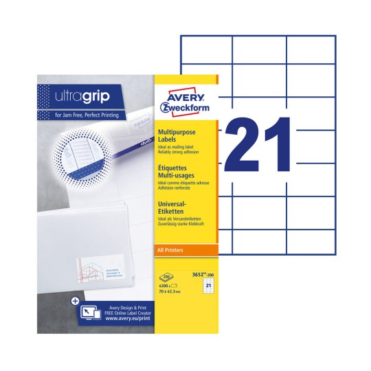 * Zelfklevende etiketten op A4-vellen. * Geschikt voor (kleuren)inkjet/laserprinters en kopieermachines. * Vlekvrij afdrukresultaat. * Stevig klevend. * Rechte hoeken. * Ook geschikt voor kopieermachines. * Perfect afdrukresultaat. * Gegarandeerd storingvrije doorvoer. * FSC-gecertificeerd. * Zuurvrij. * Gratis online templates en ontwerpsoftware beschikbaar op http://www.avery.eu.