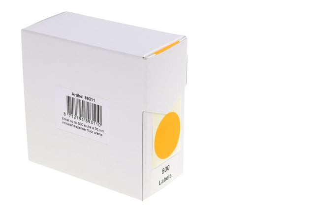 Merk: Rillprint Soort: Handbeschrijfbaar etiket Vorm: Rond etiket Aantal: 500 etiketten per rol Kleur: Fluor oranje Afmeting: 35mm doorsnede