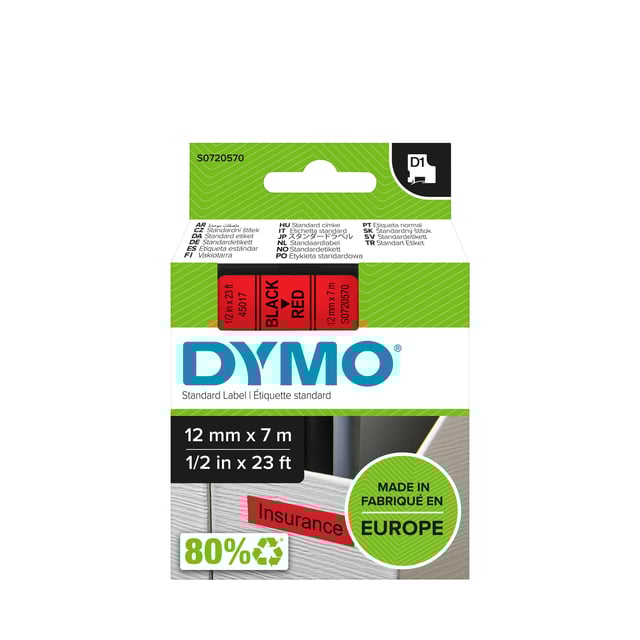 * De standaard Dymo D1 tapes zijn geschikt voor gebruik op gladde en vlakke ondergrond. * Indien u de tapes op een gebogen oppervlak wilt gebruiken, zoals stroomkabels, dan moet u de Dymo D1 flexibele nylon tape gebruiken. * Voor ruwe oppervlakken is de Dymo D1 permanent polyester tape het meest geschikt. * De standaard D1 tape is geschikt voor vrijwel alle Dymo LabelManagers en Dymo LabelPoint tape printers. * D1 tapes zijn niet geschikt voor tape printers van andere merken en ook niet geschikt voor LetraTagen en Rhinoprinters. * Met een 12mm brede tape kunt u zeer duidelijke belettering aanbrengen. * De 12mm tape is de meest gebruikte tape en daarmee geschikt voor alle normale beletteringstaken. * Hou rekening met de marges die langs de randen van de tape nodig zijn voor de printer, de tekstgrootte zal maximaal 9mm zijn. * De bandlengte is 7m. * De kleur van de tape is rood de opdruk zwart.